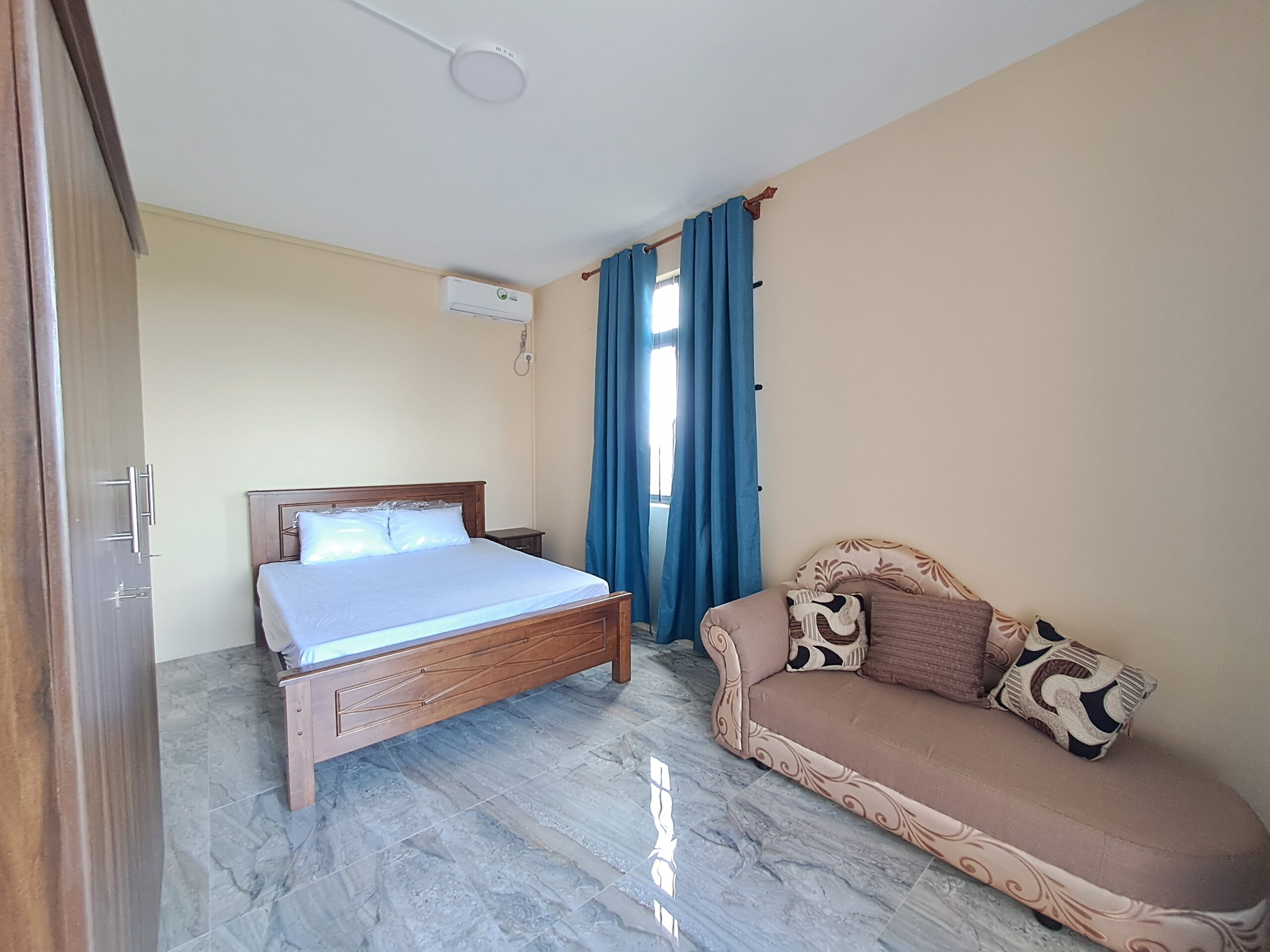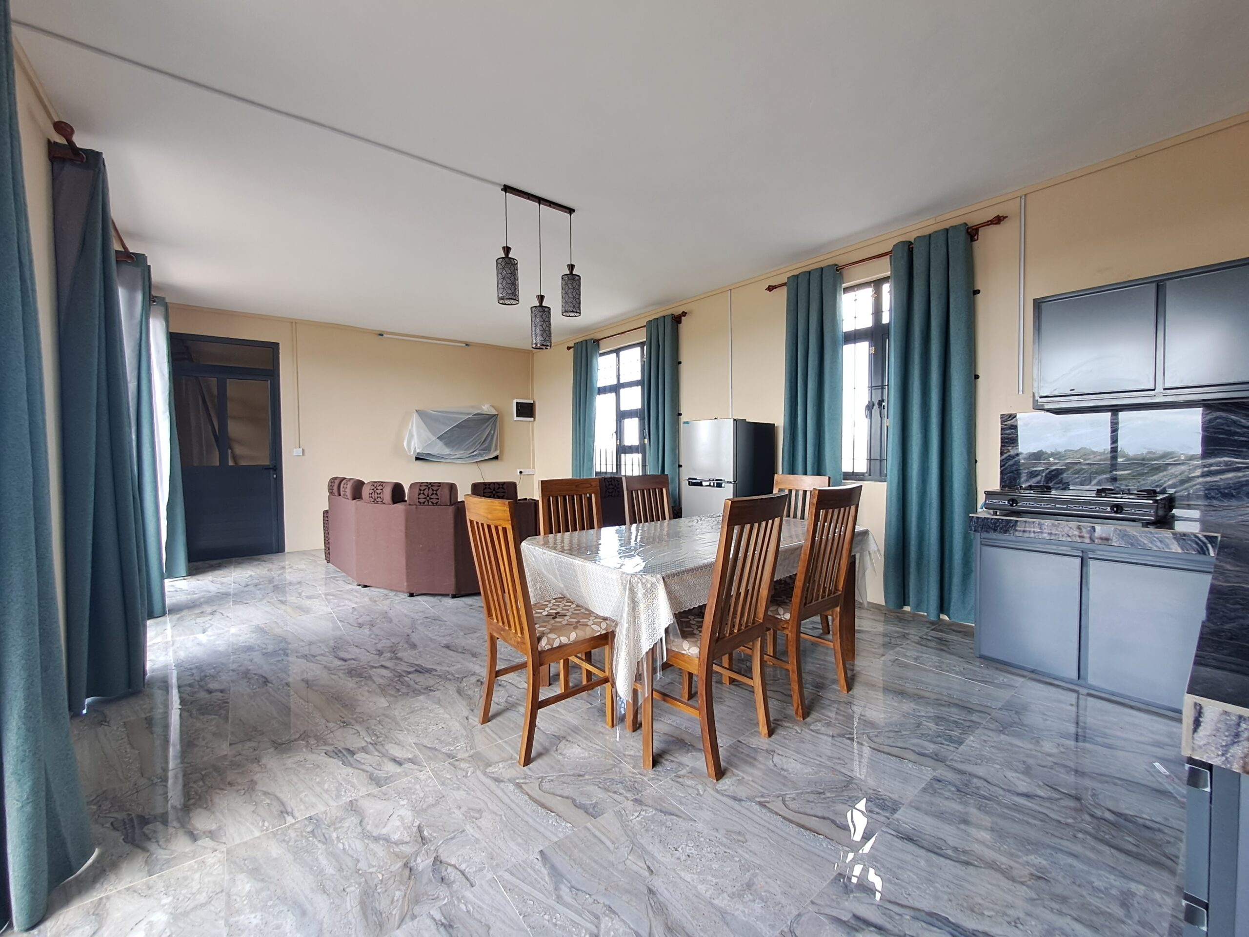 La maison dispose d’un salon, d’une salle à manger et d’une cuisine ouverts, ainsi que de trois chambres climatisées qui offrent des espaces privés calmes et confortables. Une salle de bains et des toilettes bien équipées complètent l’agencement.