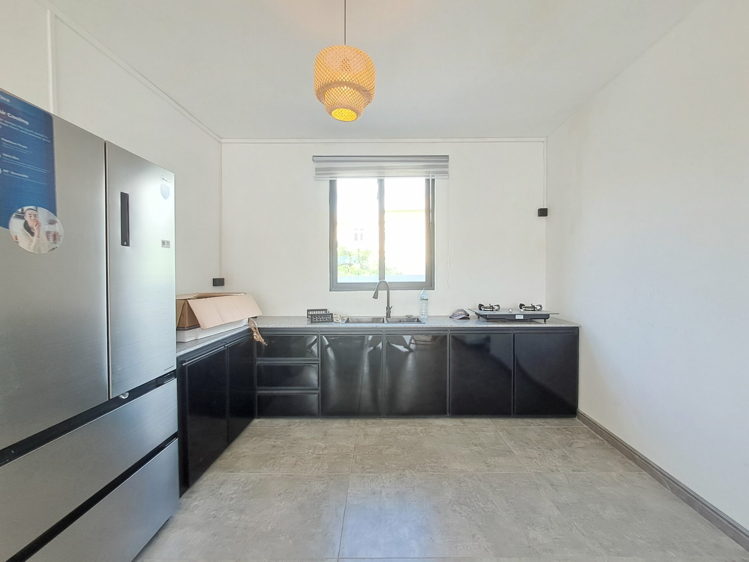 La maison comprend deux chambres et un bureau qui peut facilement servir de bureau à domicile. Le salon et la salle à manger ouverts créent une atmosphère lumineuse et accueillante, et communiquent de manière fluide avec une cuisine entièrement équipée. Une salle de bains et des toilettes communes complètent l’aménagement intérieur.