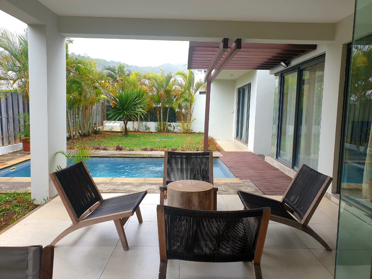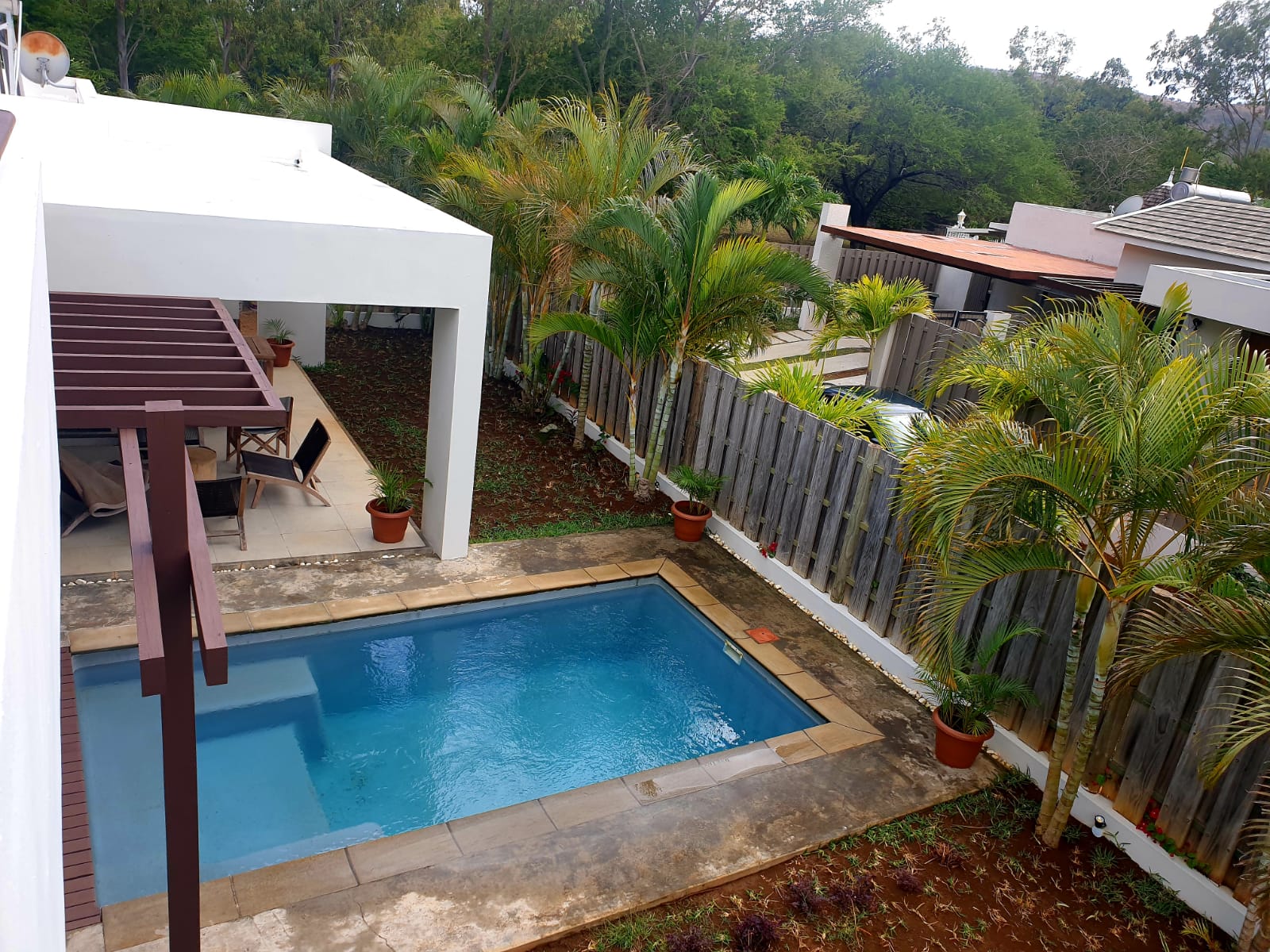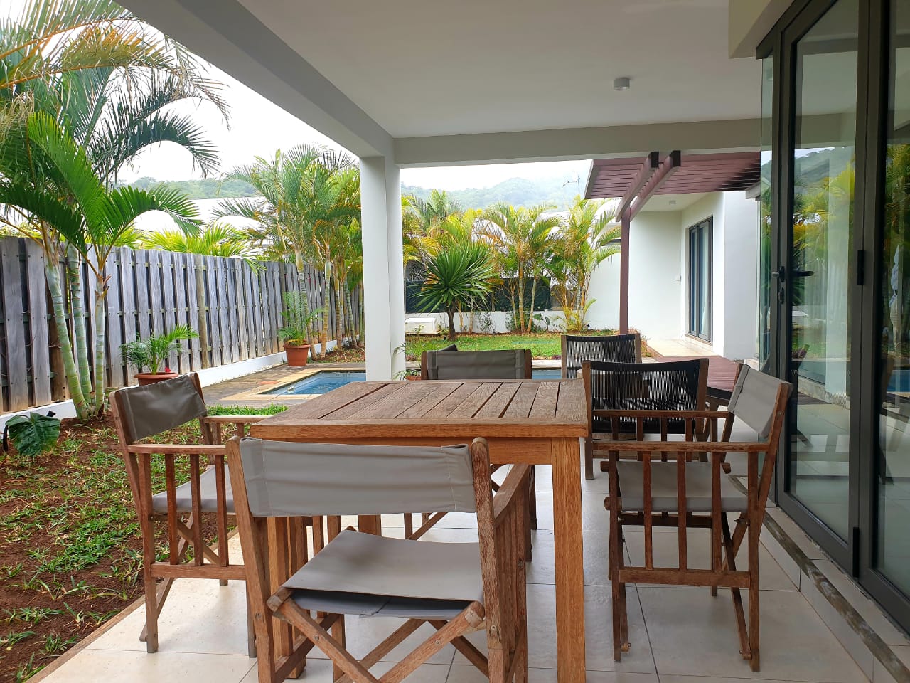 Belle villa entièrement meublée. 3 chambres, salon et salle à manger, climatiseur dans toutes les chambres et salon. Piscine privée avec patio, terrasse et jardin tout autour de la villa. Résidence clôturée avec sécurité.